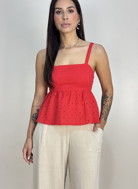 Blusa em laise tecido 100%algodão proporcionando toque macio e conforto. A peça traz um toque de romantismo e feminilidade com sua modelagem e tecido delicado. Possui alças largas reguláveis, e modelagem mais ajustada até o baixo busto, com recorte anatômico e elástico nas costas proporcionando maior conforto e vestibilidade. Finaliza em peplum franzido, trazendo um toque feminino.