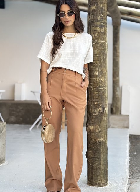 Calça em viscose mista com elastano, tecido com boa elasticidade, resistência, caimento leve e toque macio. A peça traz um visual sofisticado e elegante, inspirada na alfaiataria feminina. Possui abertura em braguilha, cós anatômico, passantes, pregas e bolsos facas. Acompanha um cinto de couro fino.