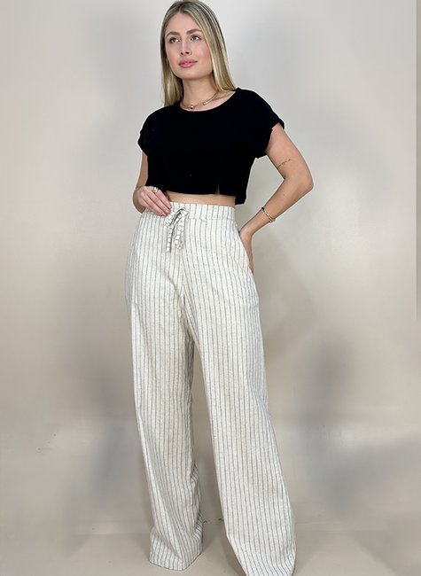 Calça em linho misto com elastano, tecido com boa elasticidade, aspecto rústico, caimento leve e toque macio. A estampa listrada e o corte pantalona alonga a silhueta. Possui cós com elástico nas costas, rolete ornamental, bolsos faca e bolsos externos nas costas. Contém forro.
