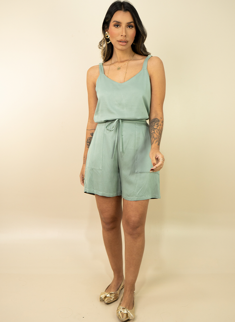 Conjunto em viscose sarjada, tecido com caimento leve e toque macio. Composto por blusa e shorts a composição traz uma estética descontraída e veranil. A blusa de alcinha larga com reguladores contém decote em V e corte acinturado. O shorts forrado, possui cós largo com elástico nas costas, roletê ornamental e bolsos externos.
