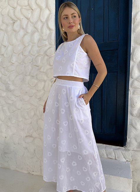 Conjunto em laise, tecido bordado com textura e vazados, criando uma estética delicada e feminina. Composto por cropped e saia longa o conjunto evoca a sofisticação de festiva de ano novo. O cropped possui modelagem mais ajustada com recorte anatômico formando desenho a partir dos ombros e abertura em gota nas costas com botão. A saia longa corte em evasê, possui bolsos faca e cós com elástico nas costas proporcionando melhor vestibilidade e conforto. Contém forro.