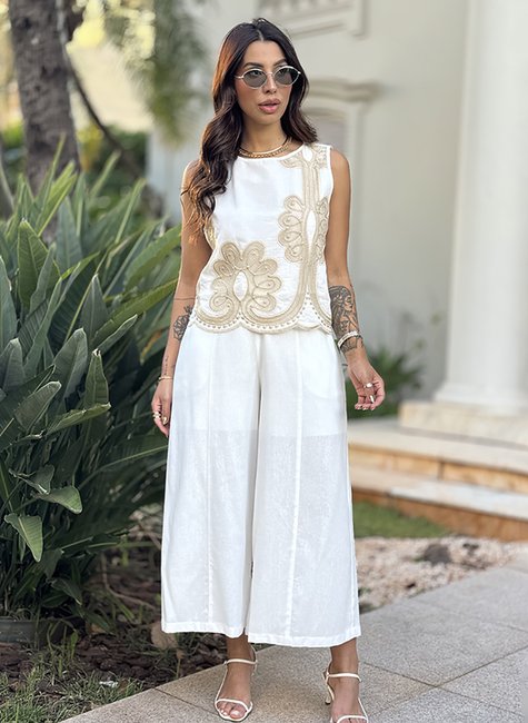 Cropped em voal bordado, tecido composto por fibras de algodão e poliéster, proporcionando conforto, caimento levemente estruturado e resistência. A peça evoca sofisticação e romantismo com bordado barrado. Possui forro, abertura em gota nas costas, decote redondo e cavas com acabamento em viés.