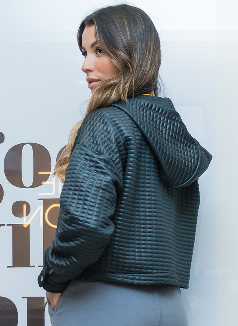 Jaqueta em matelassê composto por poliéster e elastano. Com maquinetado retangular e brilho semelhante ao cirrê. Possui comprimento cropped com capuz, punho com botões, abertura em vista com botões, cava deslocada e bolsos externos com lapelas.