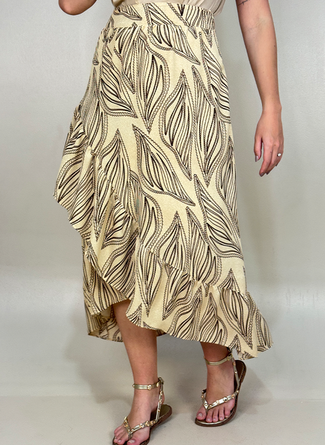 Saia mídi em crepe estampado, tecido com caimento leve e fluidez. A estampa em padrão de folhagens cria uma estética romântica e feminina. A peça possui corte evasê com franzido trazendo movimento e volume. Com cós e abertura em zíper na lateral, contém forro, proporcionando conforto e melhor vestibilidade. A modelagem em transpasse traz um desenho frontal arredondado e a barra é formada por babado franzido.