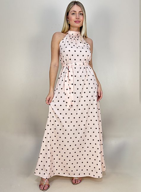 Vestido longo em crepe estampado com elastano, tecido com boa elasticidade, caimento leve e fluidez. A peça segue corte evasê levemente acinturado, com decote franzido e gala em faixa com amarração nas costas. A estampa se une a modelagem e leveza do tecido e criam uma estética sofisticada, romântica e leve. Possui forro e acompanha uma faixa larga..