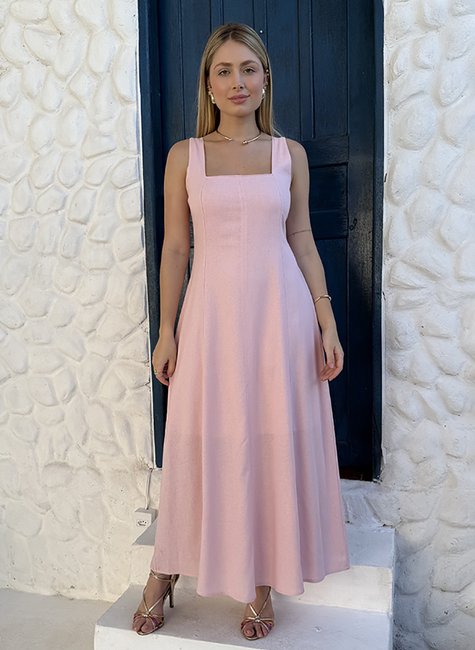 Vestido em linho misto, tecido com aspecto rústico, caimento leve e toque macio. Longo, possui corte levemente azinturado, com alças largas unidas a cava. Contém decote quadrado, recorte anatômico em linho princesa que segue do decote até a barra e elástico nas costas. Possui forro.