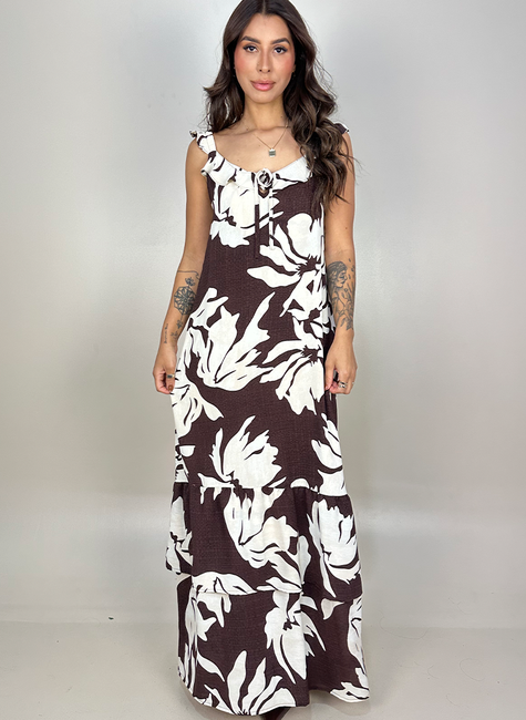 Vestido longo em crepe estampado, tecido com caimento leve e fluidez. A peça possui detalhes em babados, criando uma estética romântica e ultra Feminina. Em alças largas com elástico e aplicação de babado, contém decote em V com babado godê sobreposto, abertura em gota, e tiras finas para amarração. O corte acinturado traz um desenho em evasê a partir da cintura, finalizando a barra em babado com sobreposição de babado franzido menor. Possui forro.