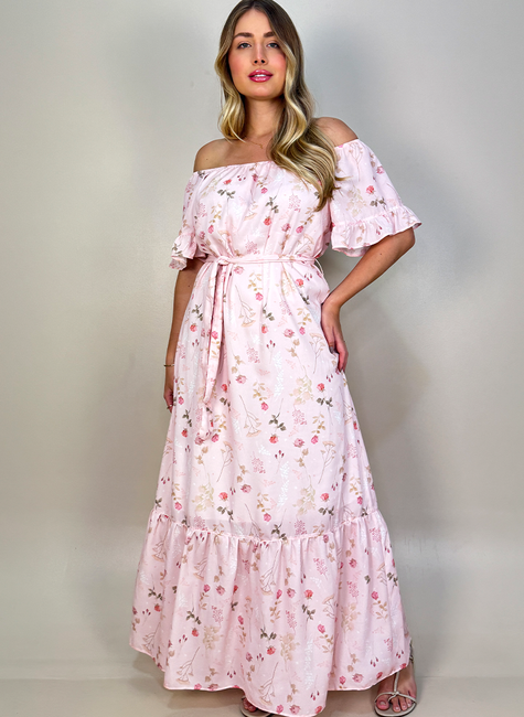 Vestido longo em crepe estampado, tecido com caimento leve e fluidez. Com estampa floral exclusiva em tons suaves, inspirada nos campos, leveza e delicadeza do verão. A peça possui corte evasê com leve acinturado, decote quadrado franzido e mangas soltinhas com barra em babado franzido. A barra do vestido em babado franzido traz leveza e movimento a peça. Contém forro, passantes discretos na lateral da cintura e acompanha uma faixa larga.