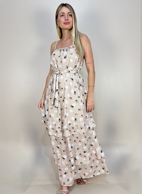 Vestido longo em crepe com estampa exclusiva MariaPoá. O padrão floral, a leveza do tecido e a modelagem mais solta com babados evoca romantismo, delicadeza feminina e a leveza do verão. Com corte em evasê, possui alcinhas com regulador, decote redondo com franzido gerando mais volume a peça, passantes discretos nas laterais e babados godês sobrepostos em recortes. Contém forro e acompanha uma faixa larga.