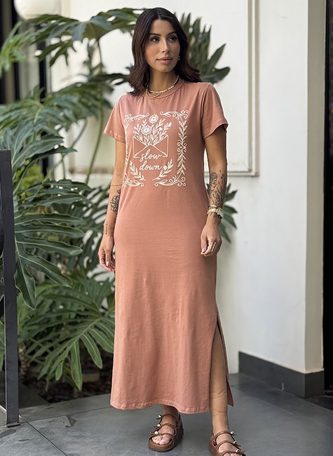 Vestido mídi em malha de algodão, proporcionando toque macio e conforto. A peça possui corte estilo camiseta, mais solto com cavas deslocadas, manga curtas, decote careca com acabamento em viés largo e fendas laterais. Possui estampa localizada frontal.