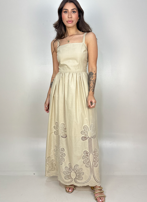 Vestido mídi em voil de algodão, tecido com caimento levemente estruturado e toque macio. A peça traz uma estética romântica com aspectos que remetem ao artesanal, como a aparência do tecido e o barrado em bordado. Com corte mais ajustado na parte superior possui costas em elástico, frente dupla com recorte anatômico em linha princesa e alças de dois centímetros com regulador. A saia da peça, com barrado, é forrada com o mesmo tecido. Em corte evasê franzido e bolsos faca.